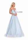 Clarisse Prom Dress 8201 is a strapless sweetheart neckline ball gown. This amazing gown comes in a Winter Blue color featuring built-in cups for support. Trimmed with remarkable crystals around the bust and waistline and zipper back, this gown was made for a star. The Silver Netting covering this gown is the additional sparkle this gown was missing.