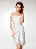 Classy and Sexy in one dress! Clarisse Atelier M6561 is a short cocktail dress, available in black and ivory. This perfect party dress has an off the shoulder neckline, a lovely brocade fabric, and a jeweled belt to really draw eyes to the smallest part of the waist. This dress is available in sizes 6 through 20.