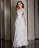 This breathtaking gown has a sheer boat neck line created by silver metallic lace. The metallic lace also creates a mock sweetheart neck exposing skin through the sheer fabric. The silver design falls off the shoulders and trims the end of the ¼ length sleeves. A simple A-line bottom completes the glamorous top. Pleating at the waist of the skirt allows effortless movement. The back of the dress reveals with a low cut back. The dress is also available in gold. This dress can be purchased in sizes 4-24 (sizes 18 and up are an additional $25).